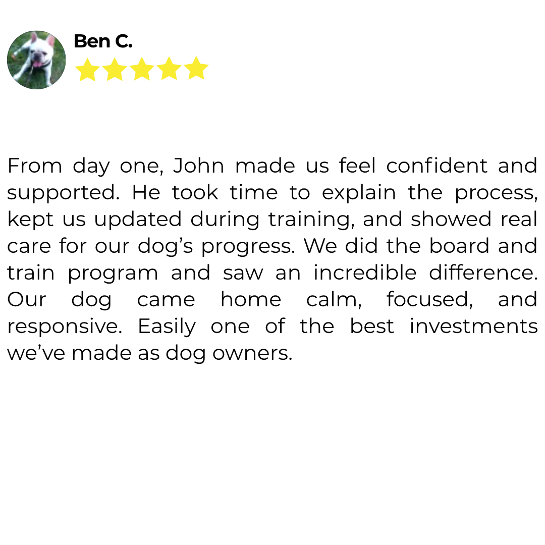 🐾 Next-Step Training Recommendations If we’re the right fit, you’ll know exactly what comes next to turn your dog into the well-behaved pet you’ve always wanted.